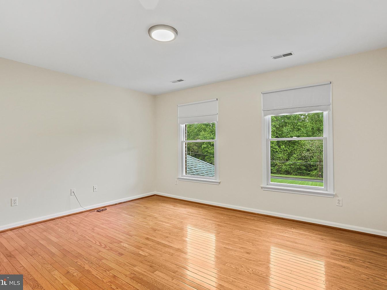 This spacious bedroom features polished hardwood floors that add warmth and elegance to the bright, airy space. Neutral beige walls offer a versatile backdrop suitable for various decor styles. Two large windows fitted with simple white roller shades allow natural light to flood the room while providing a scenic view of lush greenery outside. Ceiling vents indicate a central heating and cooling system, and a modern flush-mounted ceiling light fixture adds a contemporary touch. Multiple electrical outlets along the walls allow for flexible furniture placement and convenient use of electronics.
