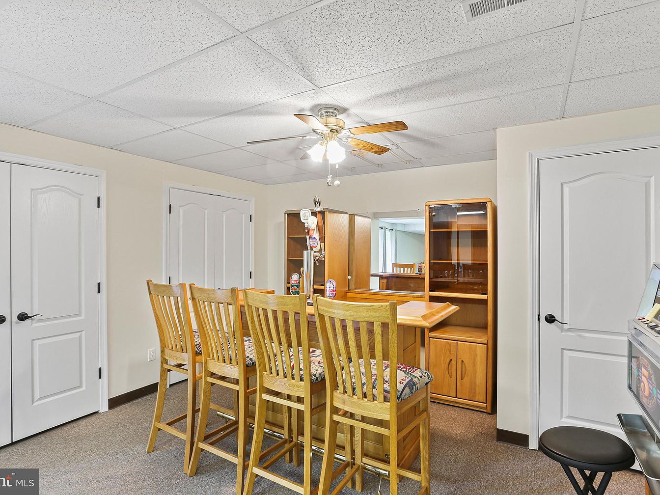 This basement space is dedicated to a home bar setup featuring a rectangular wooden bar surrounded by five tall wooden bar stools with cushioned seats in a patterned fabric. Behind the bar, matching oak cabinetry and a mirrored backdrop enhance the room’s light and sense of depth. The ceiling is finished with white acoustic tiles, and a ceiling fan with wooden blades and multiple light fixtures provides illumination and ventilation. Neutral beige walls and a subtle, low-pile carpet in a muted tone create a cozy, casual atmosphere, ideal for entertaining in a relaxed, homey setting.