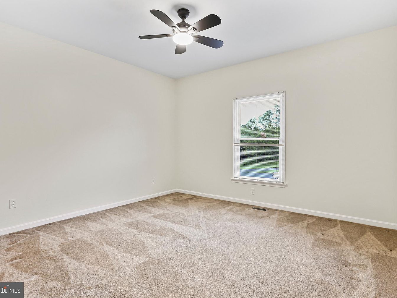 This serene bedroom features neutral-toned walls that create a calm, inviting atmosphere. The plush beige carpet provides warmth and comfort underfoot, complementing the room’s simple yet functional design. A single window with white blinds lets in natural light and offers a view of greenery outside, enhancing the airy feel. The ceiling-mounted fan with dark blades and a central light fixture adds both style and practical air circulation. Minimalistic baseboards and electrical outlets are neatly positioned, maintaining a clean and uncluttered space perfect for personalization and rest.