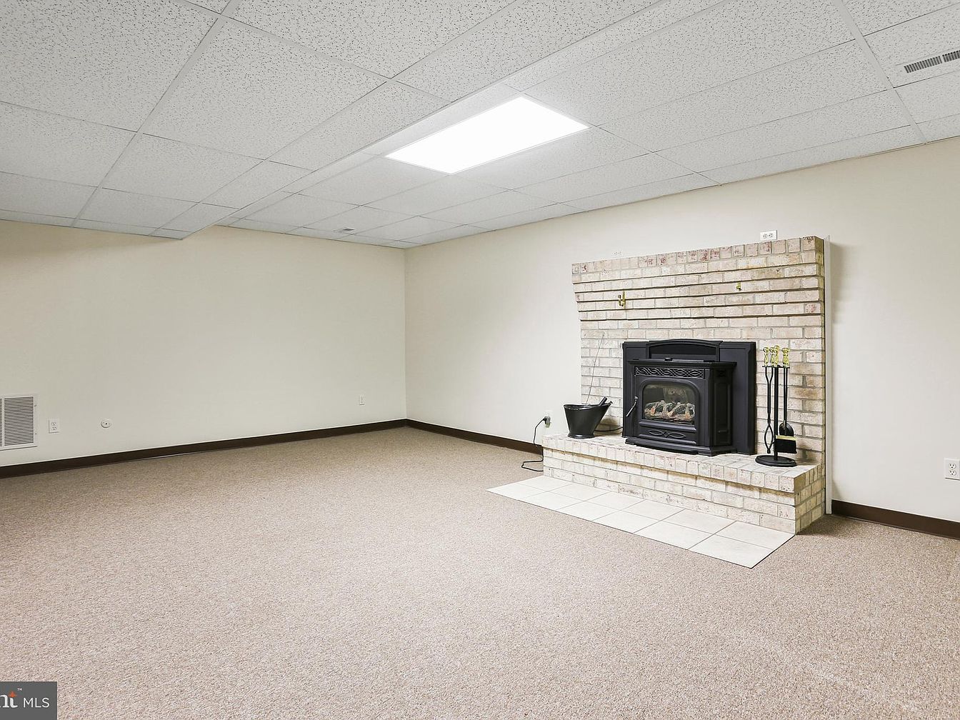 This spacious basement area features a cozy wood-burning stove inset into a light beige brick fireplace set against a soft off-white wall. The tiled hearth contrasts subtly with the neutral carpet flooring that blankets the room, creating a warm and inviting atmosphere. The room’s layout is open and uncluttered, highlighting the fireplace as the focal point. The suspended ceiling with recessed fluorescent lighting panels ensures bright illumination across the space, while the simple dark trim baseboards provide clean lines and subtle definition to the otherwise minimalist design.