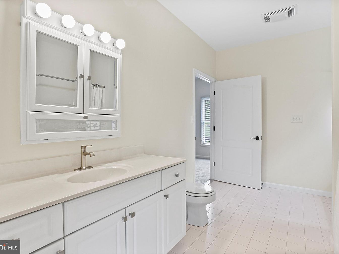 This bright bathroom features a clean, minimalistic design with a white and beige color scheme. The vanity sports white cabinetry with simple square brushed nickel handles, topped by a light-colored, smooth countertop with an integrated sink. Above the vanity, a wall-mounted medicine cabinet with mirrored doors and decorative lower panels is complemented by five round, globe-style vanity lights. The flooring is covered in light-colored square tiles arranged in a grid pattern, contributing to the overall airy feel. A white door opens to an adjacent room, inviting natural light through the window seen beyond, enhancing the fresh, spacious ambiance.