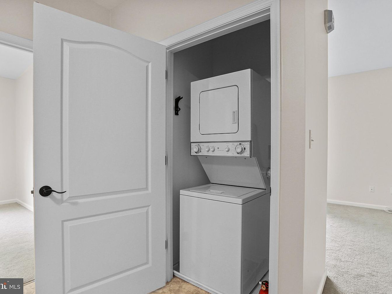 This compact laundry closet features a stacked washer and dryer unit tucked neatly behind a partially open white paneled door with a black handle. The closet is recessed into a neutral-toned wall, blending seamlessly with the surrounding space which has light beige walls and soft carpet flooring. The efficient design optimizes limited space, suitable for a bedroom area or hallway. The simplistic, clean lines and muted color palette create a minimalistic and practical laundry nook with easy access, maintaining an uncluttered and functional feel throughout the home.