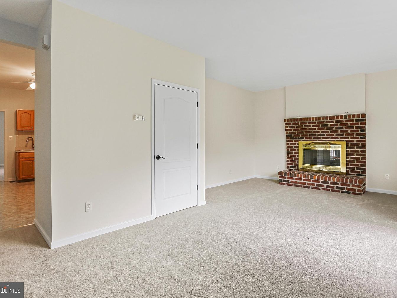 This spacious living room centers around a traditional brick fireplace with a brass-framed glass door, offering a cozy focal point. The neutral beige walls and light-colored carpet create a warm, inviting atmosphere, perfect for personalization. Architectural details are simple and clean, with a white paneled door providing access to an adjacent space. Soft, natural light brightens the room, accentuating the subtle contrasts between the brick’s rich red tones and the room’s overall pale palette. A small view into the kitchen shows wooden cabinetry and flooring, signaling an open, connected floor plan.