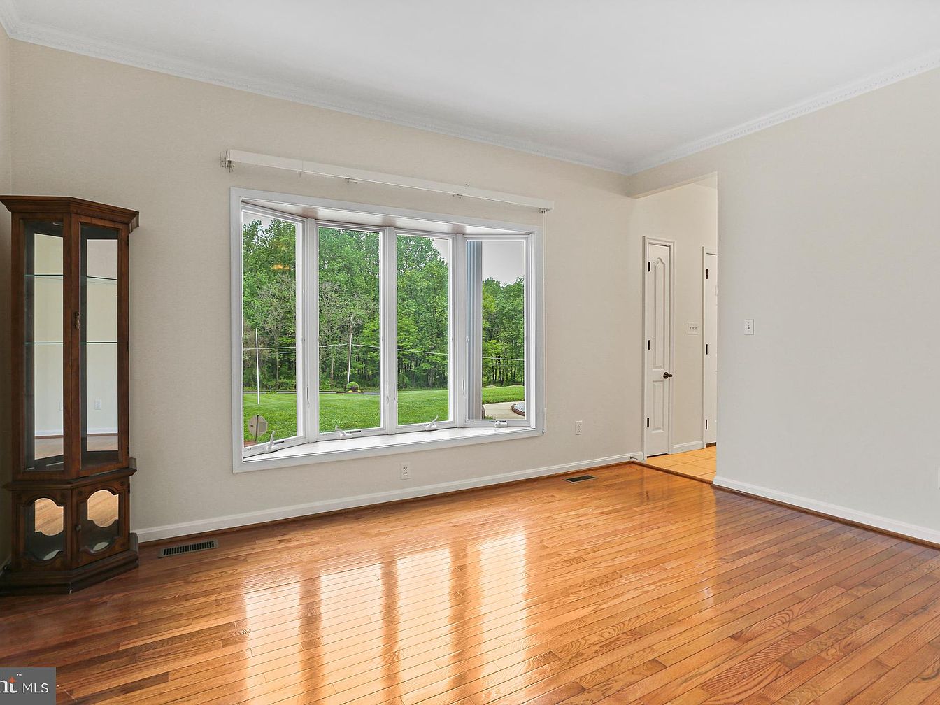 This bright living room features warm-toned hardwood flooring that adds a natural glow to the space. The walls are painted a soft, neutral beige, complementing the rich wood flooring and creating a calm, inviting atmosphere. A wide bay window with white framing floods the room with natural light and offers a scenic view of lush greenery outside. Crown molding adds an elegant architectural detail along the ceiling edge. Near the window, a classic wooden corner curio cabinet stands, providing a timeless touch. The doorway opens to a tiled transition space, suggesting flow to adjacent rooms.