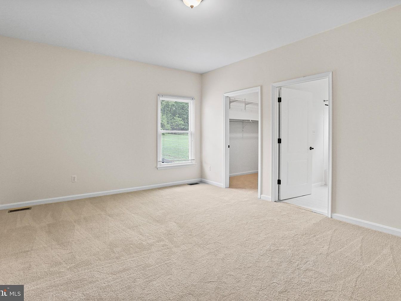 This spacious master bedroom features a neutral, soothing palette of beige walls and plush carpet, creating a warm, inviting atmosphere. Natural light streams in through a single window with wide blinds that frame an inviting outdoor view. The room is designed with functionality in mind, offering two separate doorways—one leading to a generous walk-in closet with built-in shelving and hanging space, and the other opening to a pristine, white-tiled en suite bathroom. Simple baseboards and a modest ceiling fixture complete the clean and practical design, promising comfort and ease of use.
