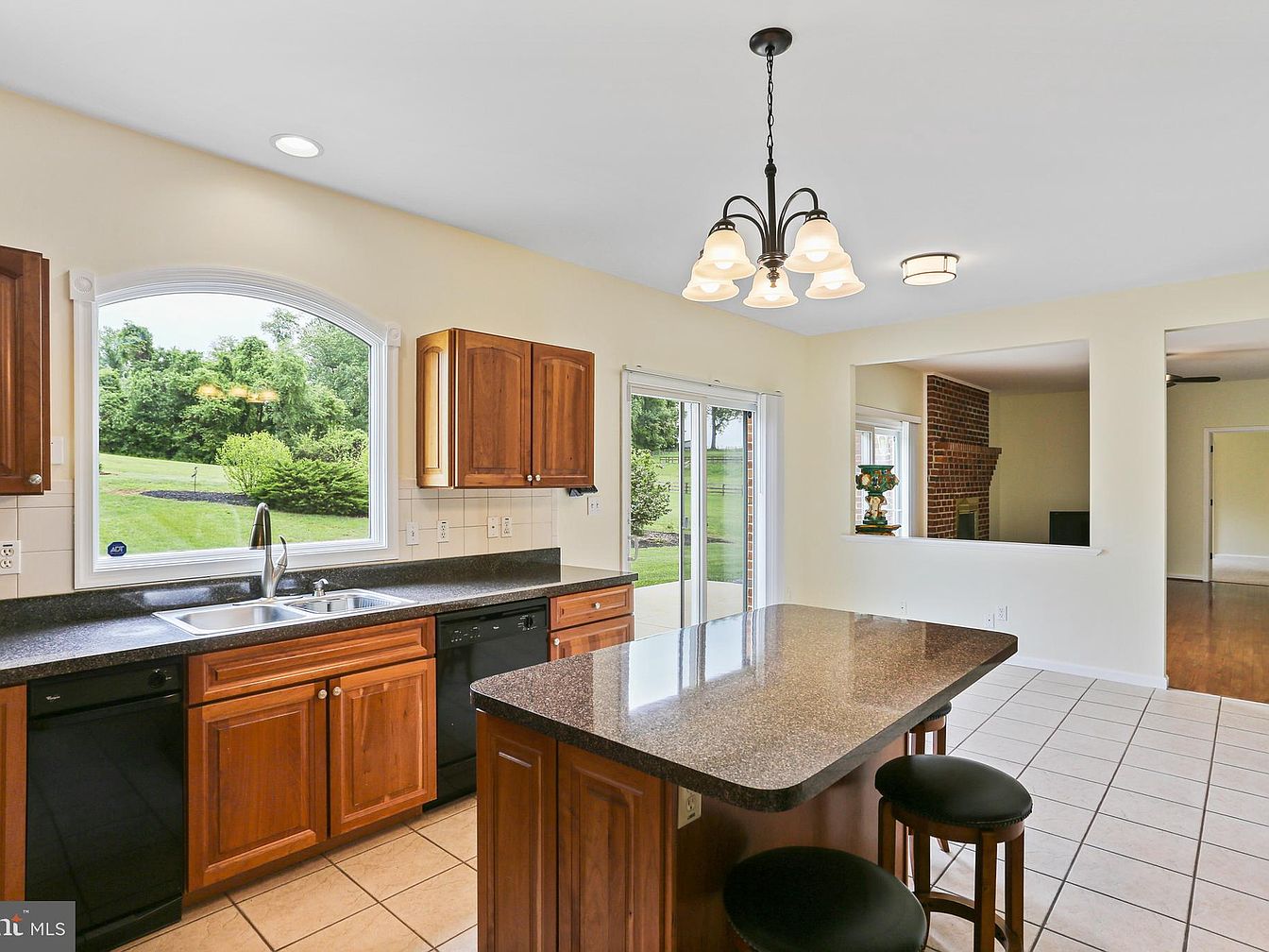 This kitchen features warm wooden cabinetry paired with dark countertops that contrast nicely against the neutral beige walls and off-white tile flooring. The large island with a polished surface serves as a central gathering spot with black cushioned stools tucked underneath, ideal for casual dining or food prep. A wide arched window over the sink provides a picturesque view of the lush green yard, flooding the space with natural light. Adjacent sliding glass doors lead out to the patio, while a cut-out pass-through connects the kitchen to a cozy living area with a brick fireplace visible. The classic light fixtures add an inviting ambiance to this open, functional space.