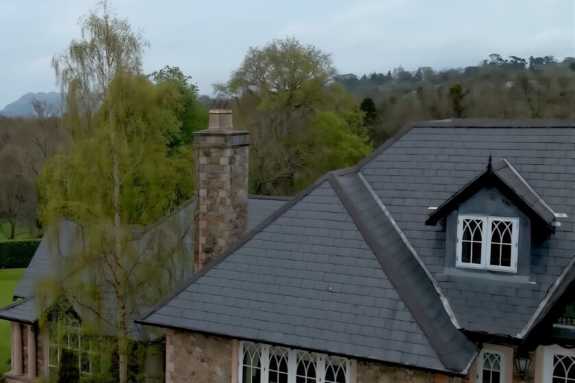 The expansive view of the surrounding landscape from above showcases the home’s integration into the picturesque scenery of south county Dublin, emphasizing the serene and private setting.