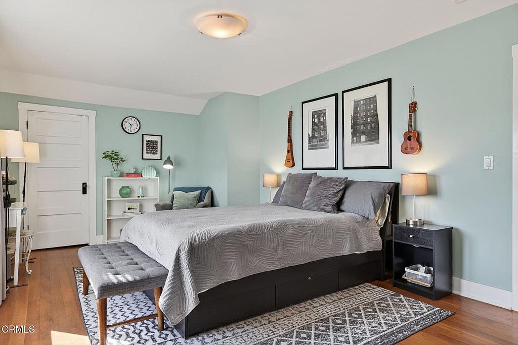 A serene bedroom features soft blue-green walls and warm, medium-tone wood flooring. The room centers around a dark wood bed dressed in gray bedding, flanked by matching dark nightstands and modern lamps. Three framed images and two string instruments hang above the bed for an artistic, personal touch. At the foot of the bed sits a cushioned gray bench on a patterned area rug. A compact white bookshelf, houseplant, and reading chair create a cozy corner near a classic white panel door. The space blends minimalist decor with subtle vintage flair, creating an inviting, restful atmosphere.