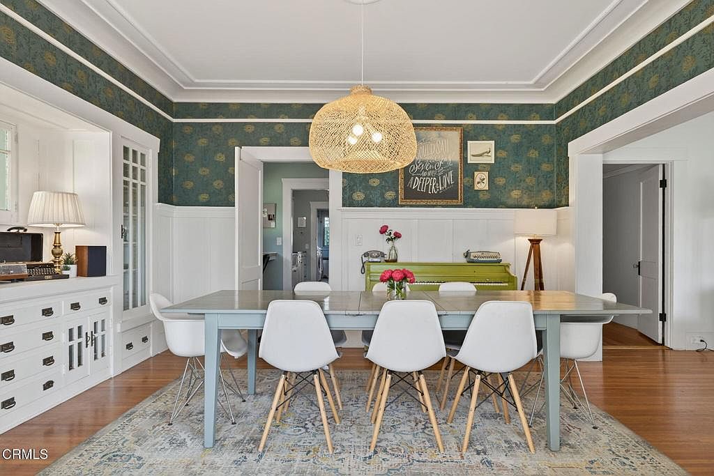 A spacious dining room with a large rectangular table sits at the center, surrounded by eight white modern chairs with wooden legs. The walls have decorative half-height white wainscoting, topped with teal patterned wallpaper that has gold botanical details. Built-in cabinetry with glass doors and brass drawer pulls lines the left wall, topped with a white table lamp and a record player. A woven rattan pendant light hangs above the table, complemented by a floral centerpiece. In the rear, a light green upright piano and tall lamp add character, while framed artwork provides vintage charm. An area rug softens the hardwood floors.