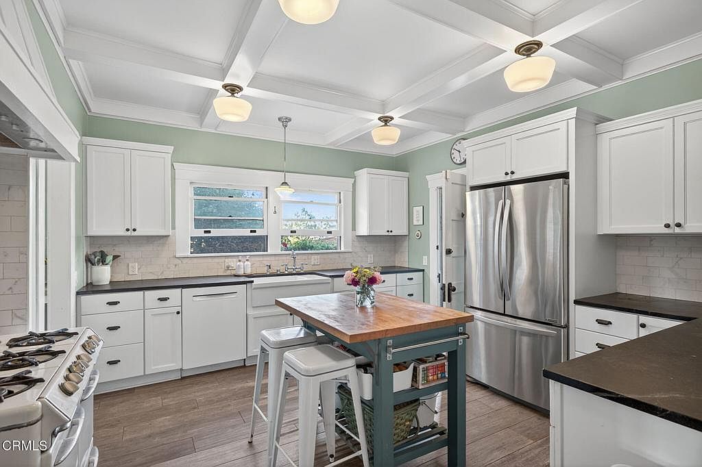 A spacious, bright kitchen with white cabinetry, black countertops, and a central wooden island creates a welcoming, functional space. The walls are painted a soft sage green that adds a calming touch, while classic subway tile backsplashes lend a timeless feel. The large window above the farmhouse-style sink brings in abundant natural light and offers a view of the outdoors. Stainless steel appliances, including a double-door refrigerator, complement the neutral color palette. Ceiling beams and multiple vintage-style light fixtures add architectural character, while the wood-style flooring provides warmth and continuity throughout the area.
