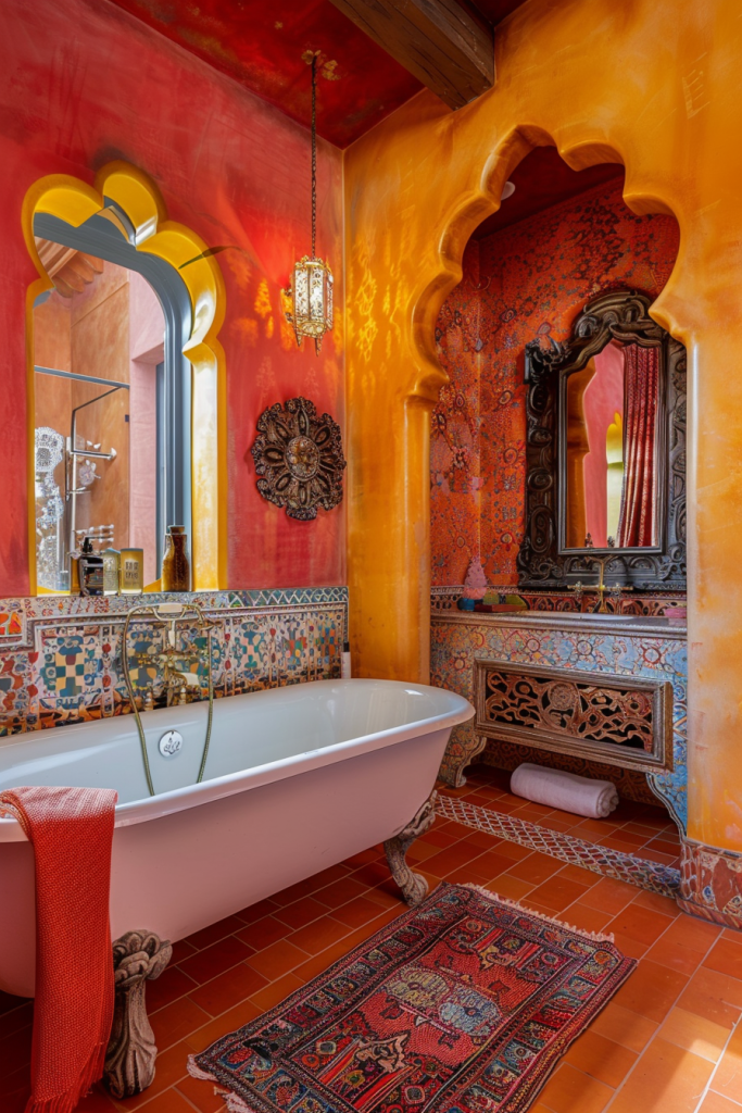The image depicts a vibrant Mediterranean bathroom with a Moroccan-inspired design. The space features a freestanding clawfoot bathtub with intricate gold fixtures, set against a backdrop of bold red and orange walls. The walls are adorned with colorful, detailed mosaic tiles, enhancing the exotic aesthetic.