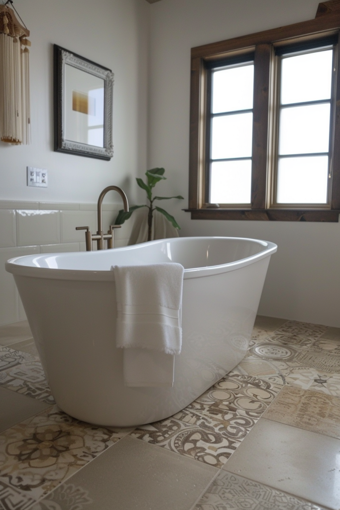 The image features a cozy and inviting Mediterranean bathroom with a warm and rustic charm. The focal point is a sleek white freestanding bathtub with a modern design, complemented by brushed brass fixtures. The floor is adorned with decorative patterned tiles in earthy tones, adding a touch of vintage elegance. A wooden-framed window allows natural light to fill the space, enhancing the warm and welcoming ambiance. The room is accessorized with a framed piece of art and a small plant, contributing to the bathroom’s homely and serene atmosphere.