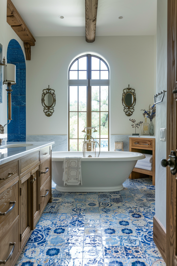 The image depicts a luxurious Mediterranean bathroom featuring a freestanding bathtub positioned in front of a large arched window. The space is adorned with intricate blue and white patterned tiles on the floor, a wooden vanity with ample storage, and gold fixtures.