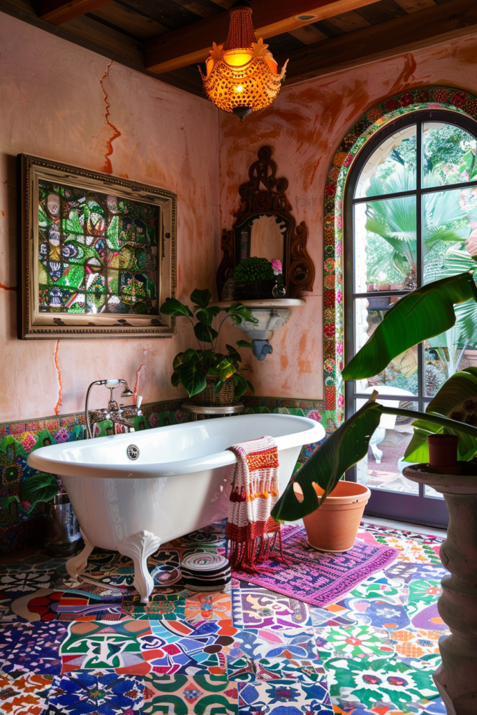 The walls are adorned with artistic mosaic patterns and a stained glass window, enhancing the lively atmosphere. Green plants add a touch of nature, while a carved wooden mirror and warm pendant lighting contribute to the room’s cozy and inviting feel. The space is filled with intricate details and textures, creating a warm and exotic ambiance.