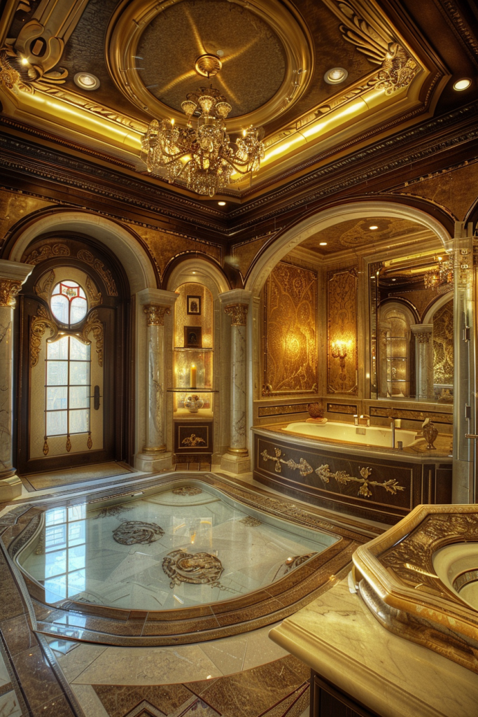 Ornate mirrors and intricate moldings add to the sophisticated ambiance. The rich textures and warm lighting create an atmosphere of elegance and grandeur, highlighting the exquisite design and lavish materials used in this sumptuous bathroom.