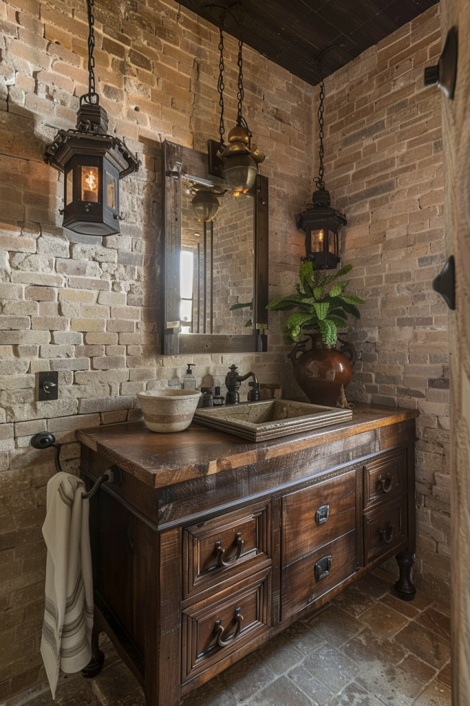 The image depicts a rustic Mediterranean bathroom with a warm and inviting atmosphere. The space features a dark wooden vanity with an integrated stone sink, complemented by wrought iron fixtures. The walls are adorned with exposed brick, enhancing the rustic charm. Hanging lantern-style lights provide soft, ambient lighting, creating a cozy and intimate feel.