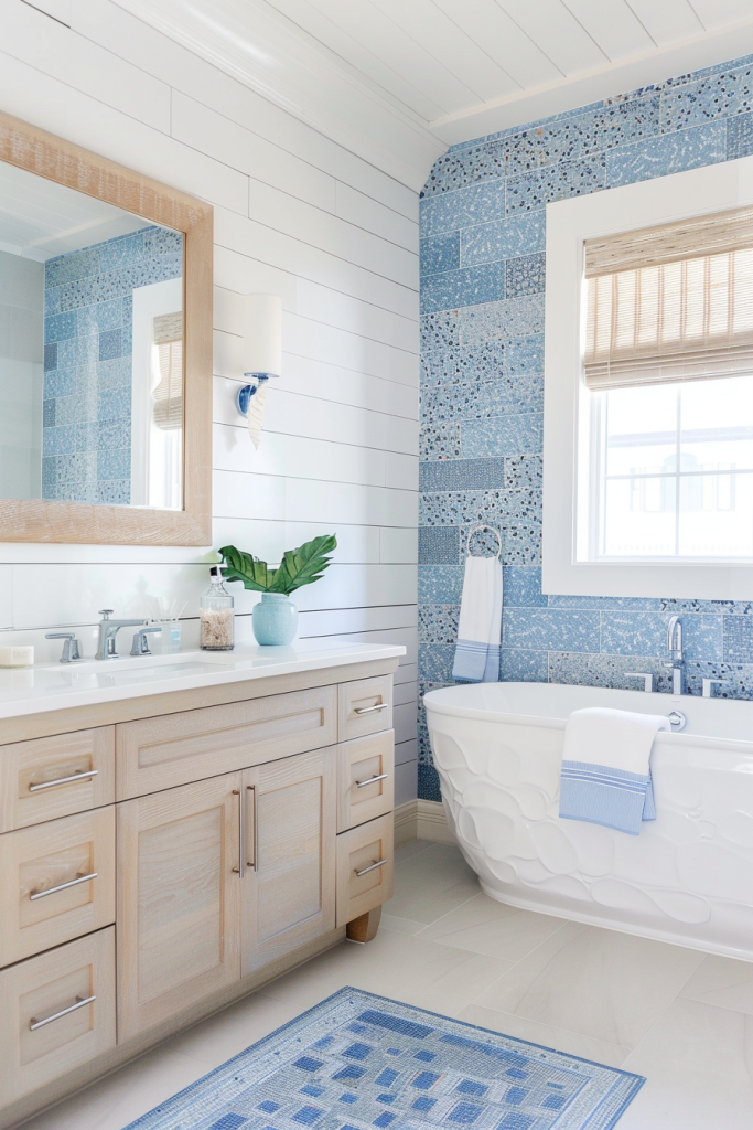The image showcases a bright and airy Mediterranean bathroom with a coastal vibe. It features a freestanding white bathtub with a unique textured design, set against a backdrop of blue patterned tiles. The light wood vanity is topped with a white countertop, complemented by a large wooden-framed mirror.