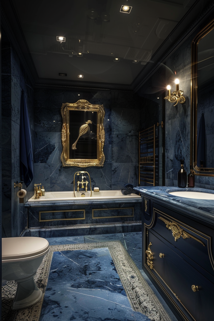 Opulent Mediterranean Bathroom with Dark Blue and Gold Accents