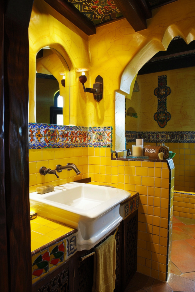 The image showcases a vibrant Mediterranean bathroom with rich, warm yellow tiles covering the walls and countertop. The design features intricate multicolored mosaic tile accents, adding a touch of artistic flair.