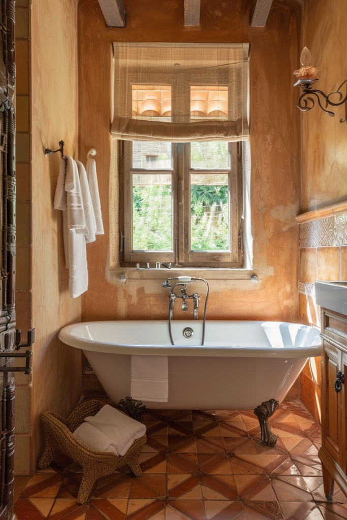 The image showcases a rustic Mediterranean bathroom with a cozy and warm ambiance. It features a freestanding white clawfoot bathtub set against a textured, earthy-toned wall. The space includes terracotta floor tiles with intricate patterns, enhancing the rustic charm.