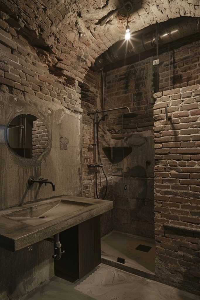 The image showcases an industrial-style bathroom with an exposed brick and concrete design. The space features a rustic concrete sink and countertop, paired with minimalist black fixtures. The shower area, enclosed by glass, maintains the raw, unfinished aesthetic with brick walls and industrial piping.