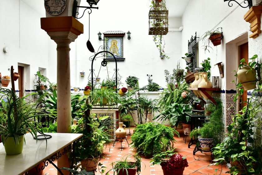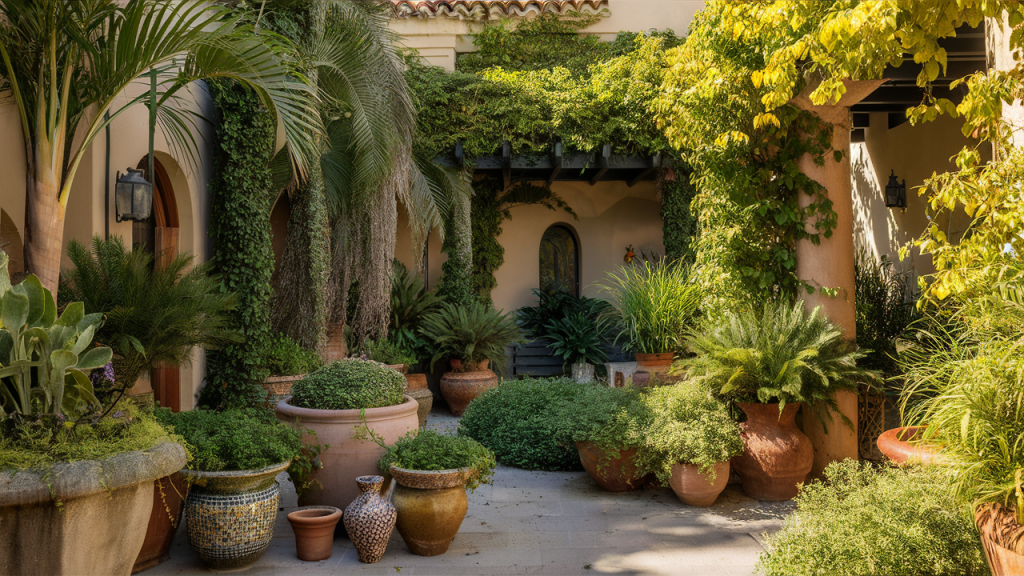 Use large terra cotta pots or glazed ceramics to cluster ferns, palms, jasmine, and citrus trees throughout the courtyard. Lush greenery softens hard surfaces, adds movement, and cools the environment naturally. The contrast between vibrant foliage and detailed tiles evokes the garden courtyards of Morocco and Andalusia.