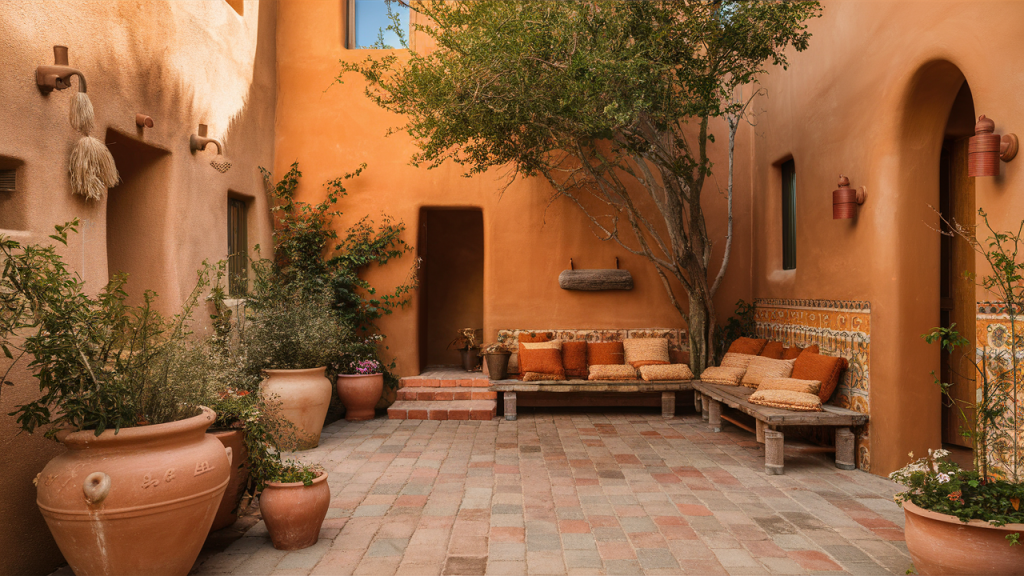 Stick to a palette inspired by sun-drenched landscapes: clay reds, sand tones, warm whites, and deep indigos. These earthy hues ground the space and offer a perfect backdrop for colorful tilework and greenery. Combined with natural materials like terracotta and wood, this palette instantly evokes the warmth of southern Spain and North Africa.