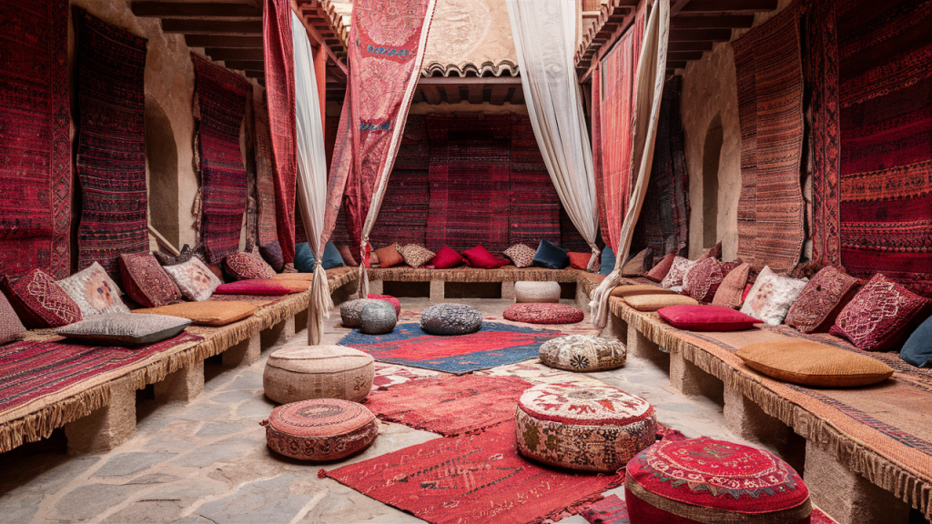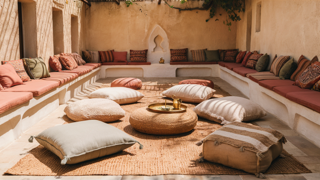 Opt for low, built-in benches or layered floor cushions to encourage lounging and conversation. Upholster them in richly patterned fabrics or earthy neutrals with pops of color. A small mosaic table nearby completes the relaxed, social vibe—perfect for sipping mint tea or hosting friends under the stars.