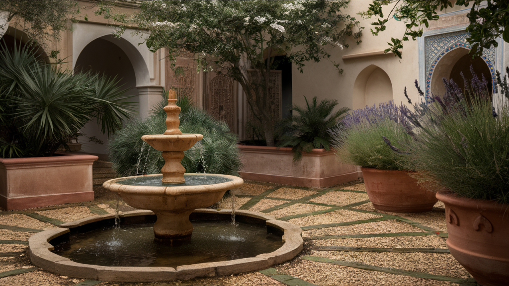 A gently bubbling fountain isn’t just decorative—it’s central to the calm, meditative vibe of a Moorish courtyard. Whether it’s a tiled basin or a tiered structure, the sound of running water cools the air and softens the space. Place it at the heart of the courtyard to create symmetry and offer a peaceful focal point for relaxation.
