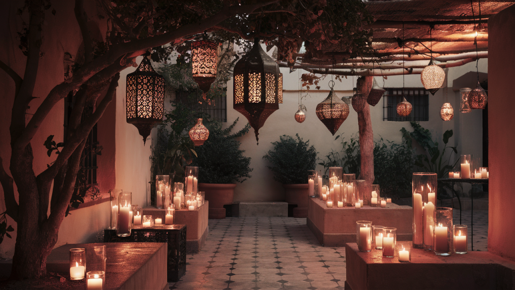 Decorative lanterns—especially in pierced metal or colored glass—create magical shadows and a warm, inviting glow. Hang them from hooks or tree branches, or cluster them on tables and ledges. Complement the ambiance with pillar candles or solar lights to enjoy the courtyard’s charm well into the evening.
