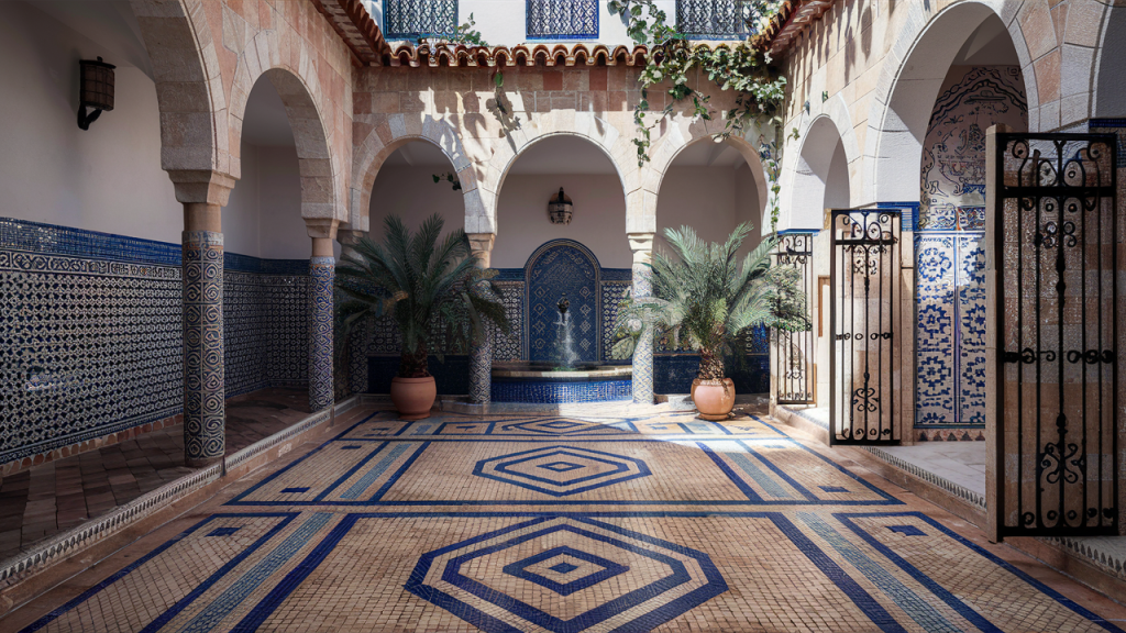 Moorish courtyards are known for their detailed geometric tiles—often in bold blues, greens, and terracotta tones. Use mosaic patterns on floors, accent walls, or tabletops to anchor the space with authenticity. The repetition and symmetry of these designs add depth and visual rhythm, making the courtyard feel timeless and alive with heritage.