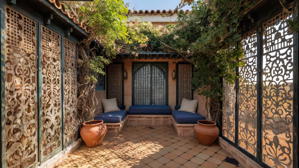 Privacy screens and lattices not only add structure but enhance the architectural feel. Choose wood or metalwork with repeating geometric patterns to echo traditional Moorish motifs. They can also support climbing plants like bougainvillea or ivy, adding softness while defining the edges of your courtyard.