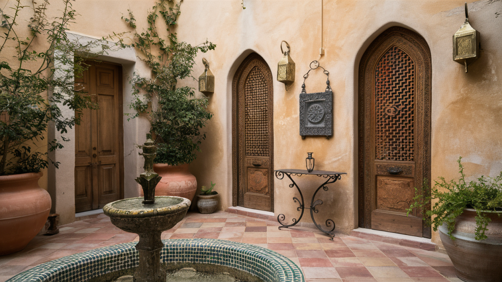 Moorish design embraces craftsmanship, and carved wood panels, brass trays, and wrought iron details bring that artisanal spirit to life. Incorporate an intricately carved door or screen for old-world charm, then layer in patinaed lanterns and hammered metal tabletops for depth. These elements add historic charm and a sense of storytelling to the courtyard without overwhelming the space.