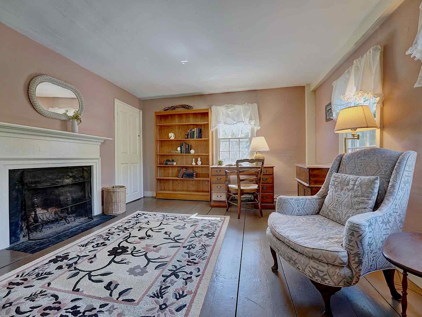 This inviting space blends classic comfort with a subtle rustic charm, featuring muted dusty rose walls that complement the rich, wide plank wooden flooring. A large floral-patterned area rug anchors the room, drawing attention to the open hearth fireplace with its simple white mantel. Adjacent, a tall wooden bookcase is sparsely decorated with books and small ceramic accents, next to a wooden desk positioned in front of a window adorned with delicate white ruffled curtains. A cozy, cushioned armchair with an intricate geometric pattern sits near a side table and a glowing table lamp, creating a perfect spot for reading or quiet reflection.