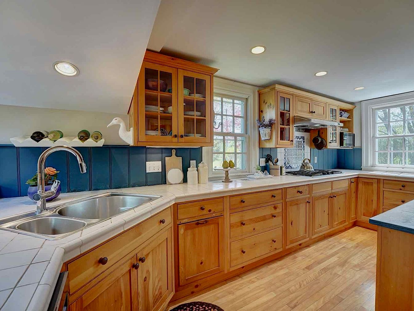 This kitchen features a warm, inviting layout with natural pine cabinetry that brings a rustic charm. White tile countertops provide a clean and durable workspace, while the backsplash is a striking navy blue vertical paneling that adds contrast and depth. The double stainless steel sink with a modern curved faucet is positioned under recessed lighting, enhancing functionality. Two large windows allow ample daylight to flood the space, highlighting the natural wood floors. Glass-front cabinets add a touch of openness, displaying neatly arranged dishware, complemented by small decorative accents like a porcelain duck and potted plants.
