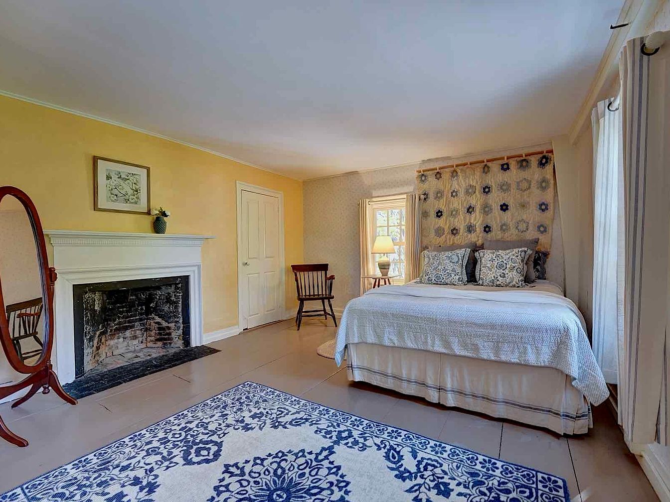 This bedroom nook features a calming color palette with soft cream walls paired with warm yellow on the fireplace wall. A bed with white and gray linens combines subtle texture and pattern from the floral throw pillows and a tapestry hanging above the headboard. The white-painted wooden fireplace mantel adds classic charm, contrasted by the blackened firebox interior. Natural light filters through curtained windows, enhancing the space’s inviting mood. A wooden chair and a tall, oval, freestanding mirror contribute to the traditional styling, while a blue-and-white patterned rug anchors the room with detailed design.