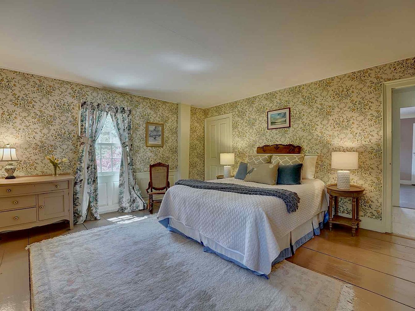 This cozy master bedroom offers a serene, vintage-inspired aesthetic marked by floral wallpaper that envelops the room in warmth and charm. The wooden floorboards are partially covered by a large, plush white area rug that adds softness underfoot. A simple yet elegant bed is dressed in white quilted bedding, complemented by neutral and navy throw pillows and a dark throw blanket. Matching bedside tables with white lamps frame the bed, while a classic wooden chair and a modest dresser anchor the room. Floral curtains frame a window, allowing natural light to brighten this inviting space.