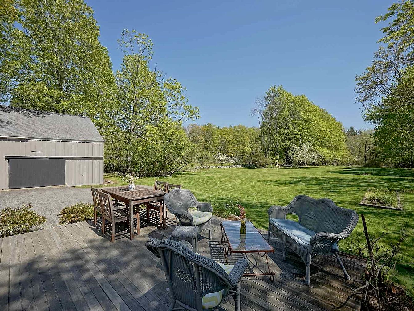 This spacious backyard offers a large, lush green lawn surrounded by mature trees, creating a private and serene outdoor environment. The main house in the background features classic colonial architecture with beige siding, multiple chimneys, and skylights lining the back roof above a cozy screened porch area ideal for relaxing or entertaining. Adjacent to the lawn are two sizable detached outbuildings with muted gray tones lending a utilitarian balance to the home’s traditional style. The clear blue sky and soft shadows add depth and warmth, emphasizing a peaceful, well-maintained property perfect for outdoor enjoyment.