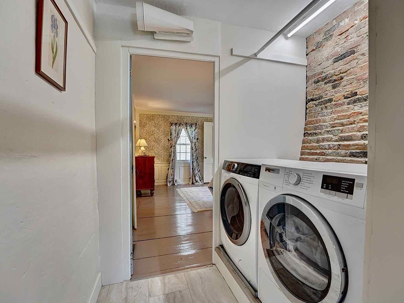 This compact laundry nook features a pair of modern front-loading washer and dryer units positioned side by side along a simple, white wall. The exposed brick accent wall adds a textured, rustic charm that contrasts with the sleek appliances. Above the machines, a minimalist fluorescent light fixture provides bright illumination. The flooring in this space consists of large, light-gray tiles, seamlessly transitioning to the warm-toned, polished wooden floor of the adjoining room. A framed botanical print hangs on the adjacent wall. The doorway offers a glimpse into a cozy, traditionally styled room with floral curtains and wallpaper, soft lighting, and a plush rug, highlighting the blend of modern utility and classic comfort within the home.