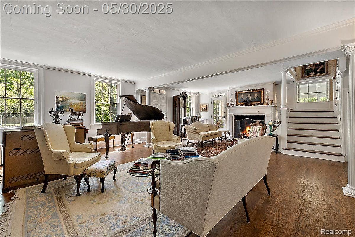 This expansive living room features an elegant yet inviting atmosphere highlighted by classic architectural elements like fluted columns and wide crown molding. Warm hardwood floors extend throughout, anchoring a series of vintage-inspired upholstered chairs and a sofa arranged around a large area rug with subtle patterns. A grand black piano takes center stage near two large windows dressed simply with white trim, allowing abundant natural light to brighten the space. A traditional fireplace with a white mantel is flanked by tasteful antique furniture and adorned with framed portraits, enhancing the room’s refined, timeless charm. An open stairway leads to an upper level, seamlessly connecting spaces.