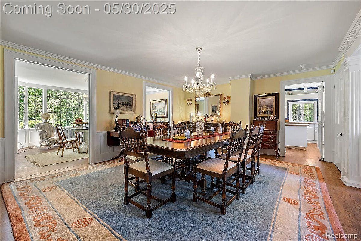 This formal dining room features a spacious layout with classic design elements. The walls are painted a warm yellow, complemented by white crown molding and wainscoting that add architectural interest. A large rectangular wooden dining table, surrounded by intricately carved chairs with upholstered seats, dominates the space. The table sits atop a sizable area rug with muted blue and orange patterns that soften the wooden floors. A crystal chandelier hangs centrally above the table, casting elegant light. French doors open to an adjoining sunroom filled with natural light, creating an inviting flow through the home.
