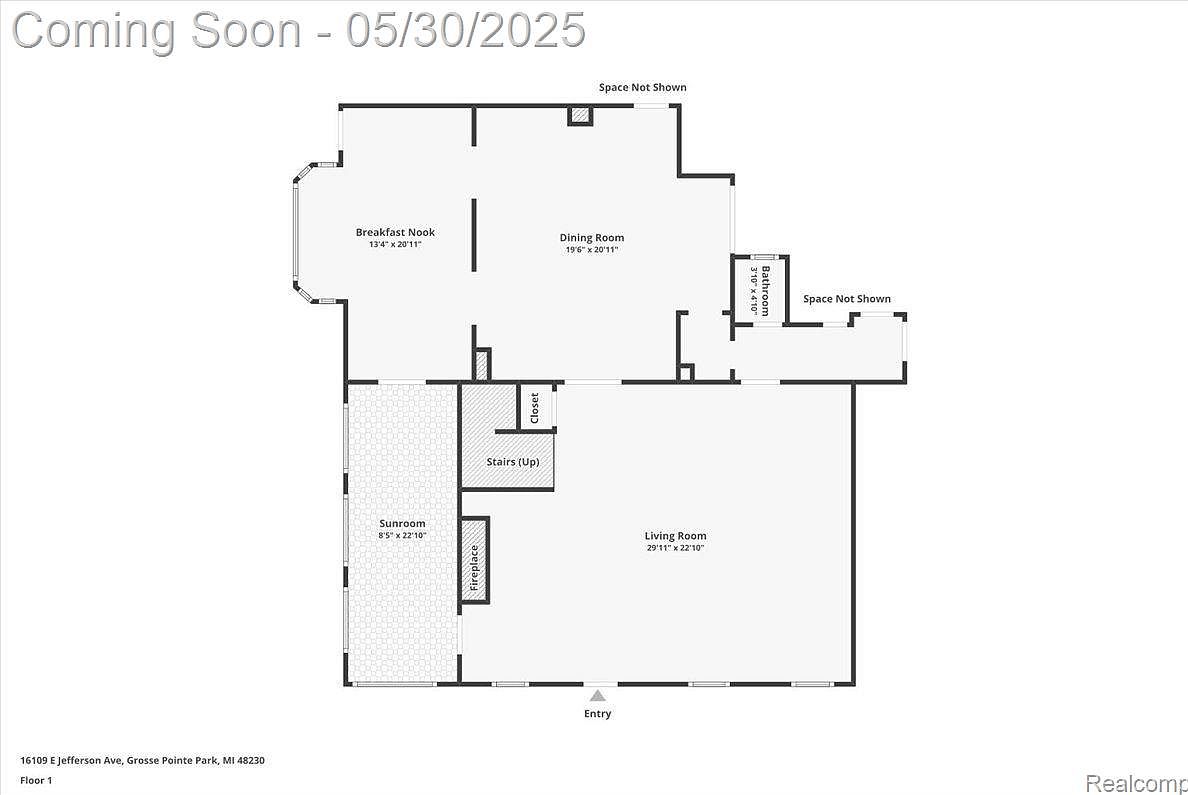This floor plan showcases the first floor of a spacious home, thoughtfully arranged for daily living and entertaining. The large living room, measuring nearly 30 by 23 feet, sits at the front of the house with an entryway leading inside. A cozy fireplace anchors the space, adjacent to a sunroom with multiple windows that flood the area with natural light. To the left, the breakfast nook and dining room share a wide open space ideal for family meals and gatherings. Additional features include stairs leading upward, a bathroom, and a sizeable closet near the central core of the layout. Overall, the design emphasizes open flow and functionality.