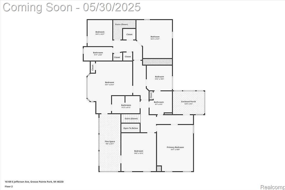 This spacious second-floor plan showcases a well-organized layout with a total of six bedrooms, including a large primary bedroom measuring 14’7″ by 18’8″. The bedrooms vary in size, with some featuring closets for added storage. There are three bathrooms scattered conveniently across the floor, providing accessibility for multiple rooms. A flex space measuring 8’6″ by 23’1″ offers versatile usage, and there is an enclosed porch accessible near one of the bedrooms, adding extra cozy space. Stairs down are centrally located, connecting to other floors efficiently. The open-to-below area adds an airy feel to the design.
