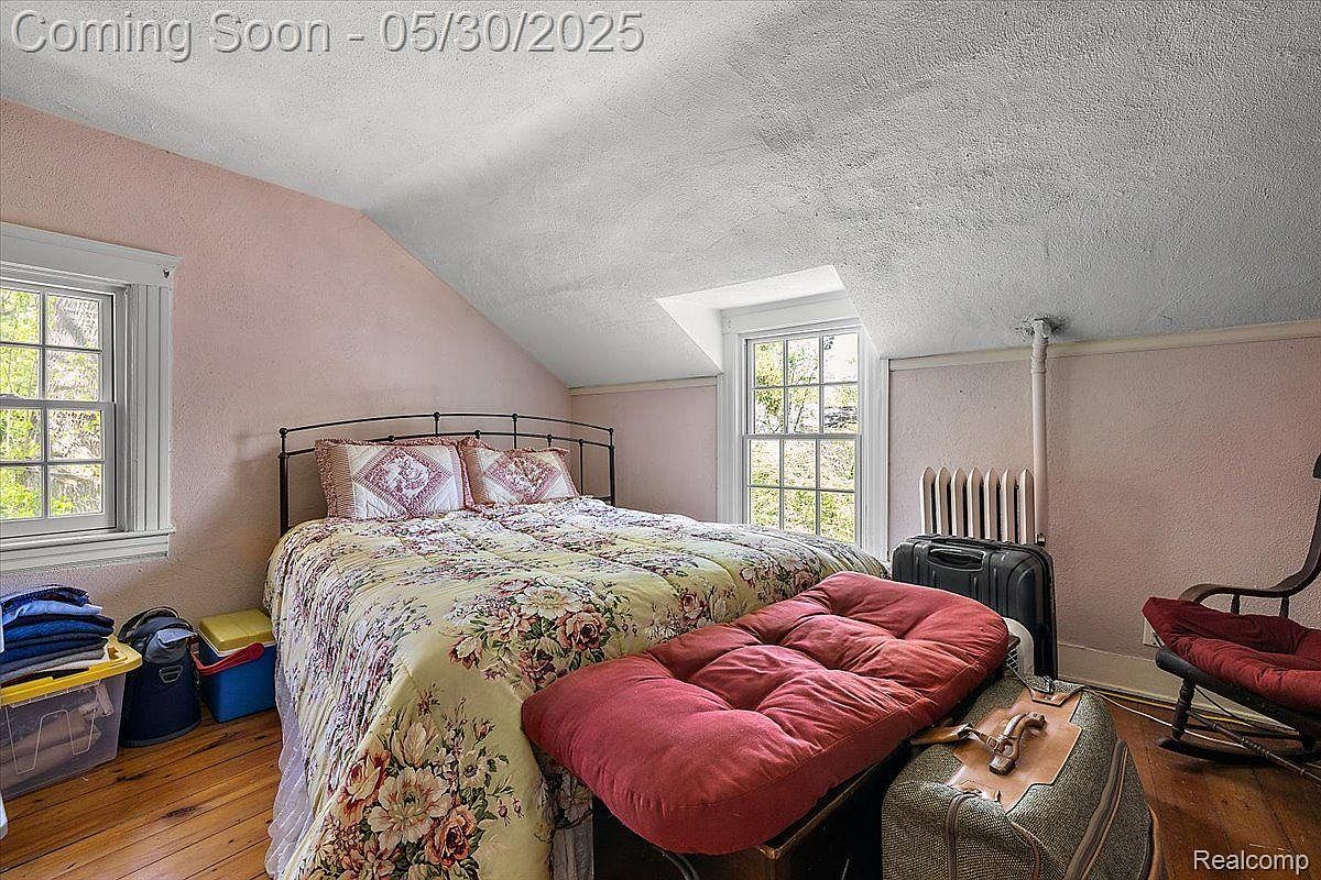 This charming bedroom showcases a quaint, cozy layout under a sloped ceiling which adds character and a snug atmosphere. Soft pink walls complement the warm, honey-toned hardwood floors, creating a gentle, inviting ambiance. A black metal bed frame with floral-patterned bedding and matching pillows adds a touch of vintage elegance. Two windows allow natural light to gently brighten the space, enhancing the airy feel despite the low ceiling. Functional elements include a plush red bench at the foot of the bed, and practical storage bins and luggage arranged neatly to one side, maintaining order in this intimate retreat.