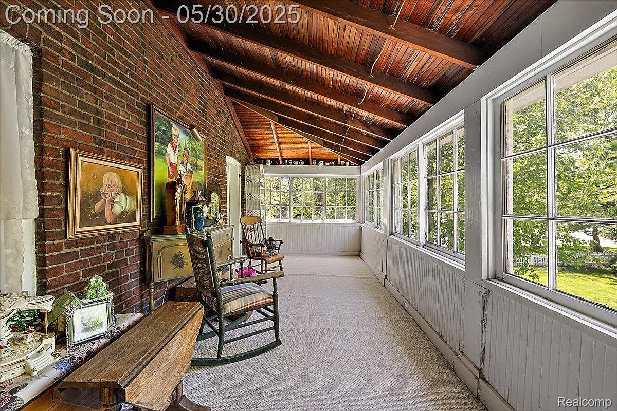This inviting enclosed porch features a warm, rustic aesthetic anchored by a rich red brick wall contrasted with clean white wood paneling beneath expansive windows. The ceiling displays exposed wooden beams with a glossy finish, adding texture and depth to the space. Natural light floods in through the multiple multi-pane windows, offering views of the lush greenery outside. Traditional rocking chairs and a small wooden chest add a cozy, homey feel, while framed artwork and decorative accents on the vintage sideboard provide a nostalgic touch. The neutral carpet unifies the room’s earthy tones and maintains a quiet, relaxed ambiance ideal for restful afternoons or casual conversations.