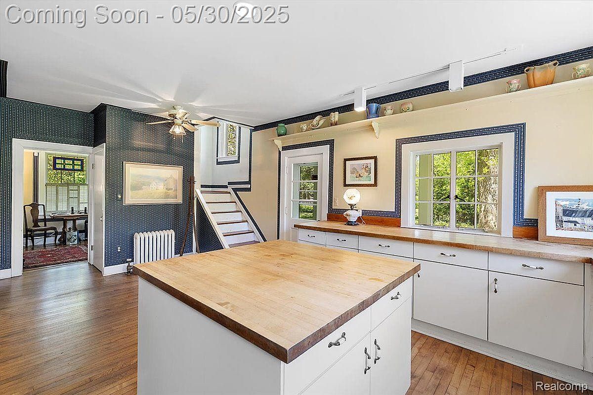 This kitchen features a spacious wooden island with a butcher block countertop, central to the room and surrounded by ample white cabinetry. The cabinetry is accented with silver hardware, offering abundant storage. Warm wood floors complement the neutral tones, blending seamlessly with dark blue patterned wallpaper that adds a vintage touch. The window and door frames, highlighted by dark blue trim, allow natural light to brighten the space, enhancing warmth and openness. Decorative ceramics atop a shelf add personality, while a ceiling fan and radiator underscore the room’s classic charm and practical functionality.