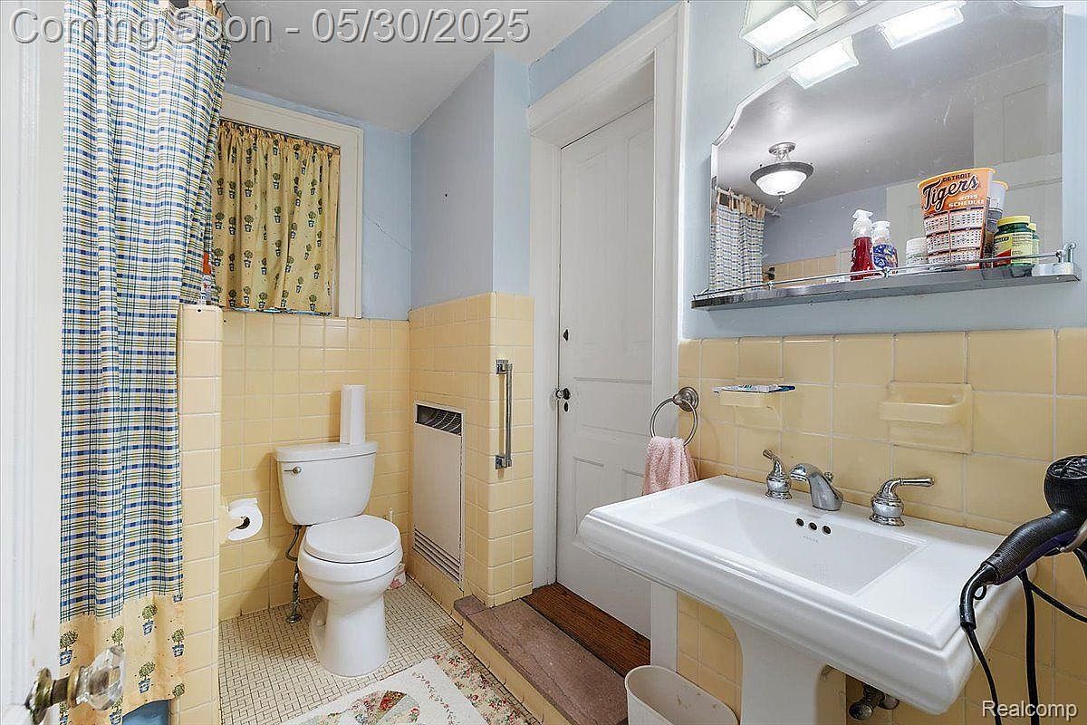 This cozy bathroom features a charming combination of light blue walls paired with vintage yellow square tiles halfway up, lending a retro yet warm atmosphere. The layout includes a white porcelain pedestal sink with chrome faucets, positioned beneath a large mirror with a built-in shelf holding personal care items. The toilet is adjacent, situated against the tiled wall, and separated visually by a partial half-wall next to the shower area, which is defined by a blue and beige plaid curtain. A soft rug with a floral pattern adds a gentle touch to the tiled floor, while the door and trim painted in white maintain a classic feel.