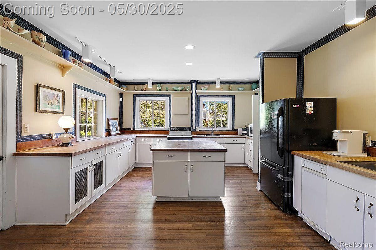 This kitchen features a generous layout centered around a functional island with storage cabinets, perfect for meal prep. The space is framed by white cabinetry topped with natural wood countertops that add warmth against the beige walls. Dark blue decorative trim accents the room, drawing attention to the window frames and upper wall shelving where an assortment of ceramics is displayed, lending a charming, personalized touch. The dark refrigerator contrasts with the otherwise light palette while complementing the hardwood floor, which provides continuity and a cozy feel. Ample natural light from the windows brightens the entire room.