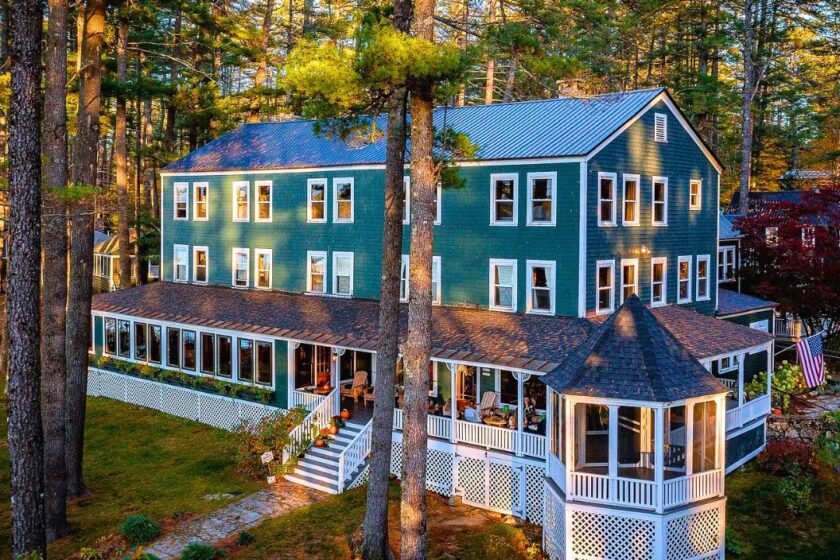 Nestled on Kezar Lake in Lovell, Maine, this grand 1911 lodge blends rustic charm with elegance. Offering 12 bedrooms and 15 baths across 10,581 sqft, it features expansive lake views, a commercial kitchen, and a 100+-seat dining room. Recent upgrades, including a new HVAC system, ensure modern comfort. The property sits on 1.6 acres with 544 feet of waterfront and boasts an iconic porch, two docks, and a cozy fireplace. Priced at $2.200000, it’s perfect for hosting events or as a family retreat.