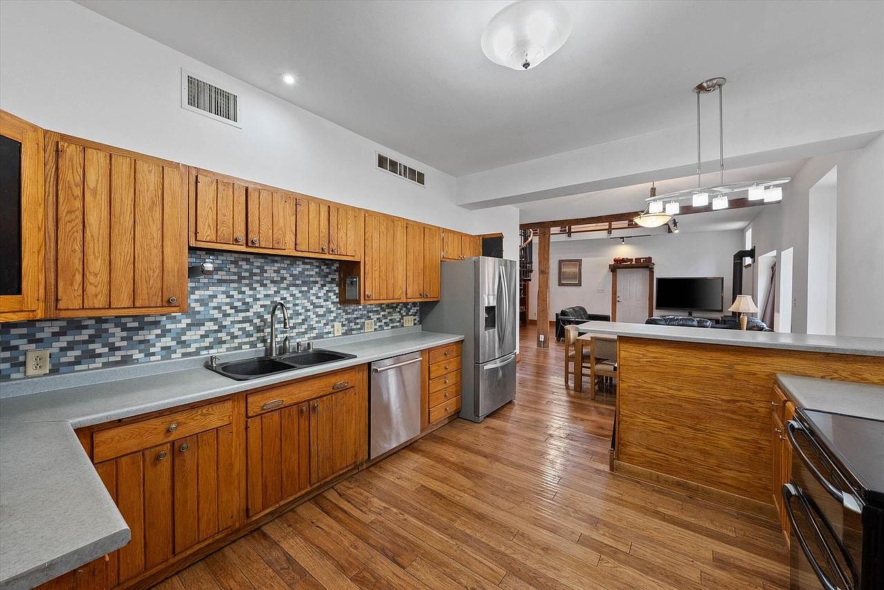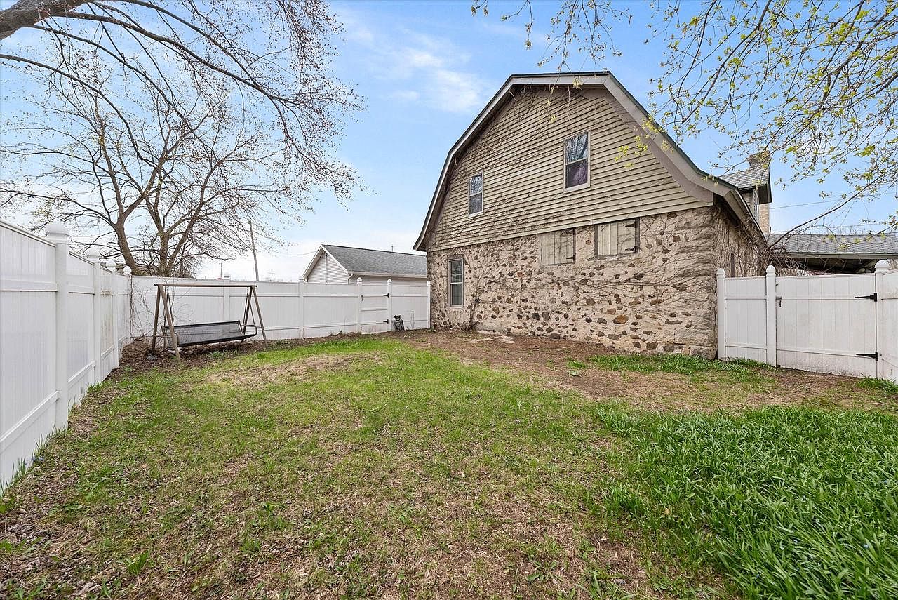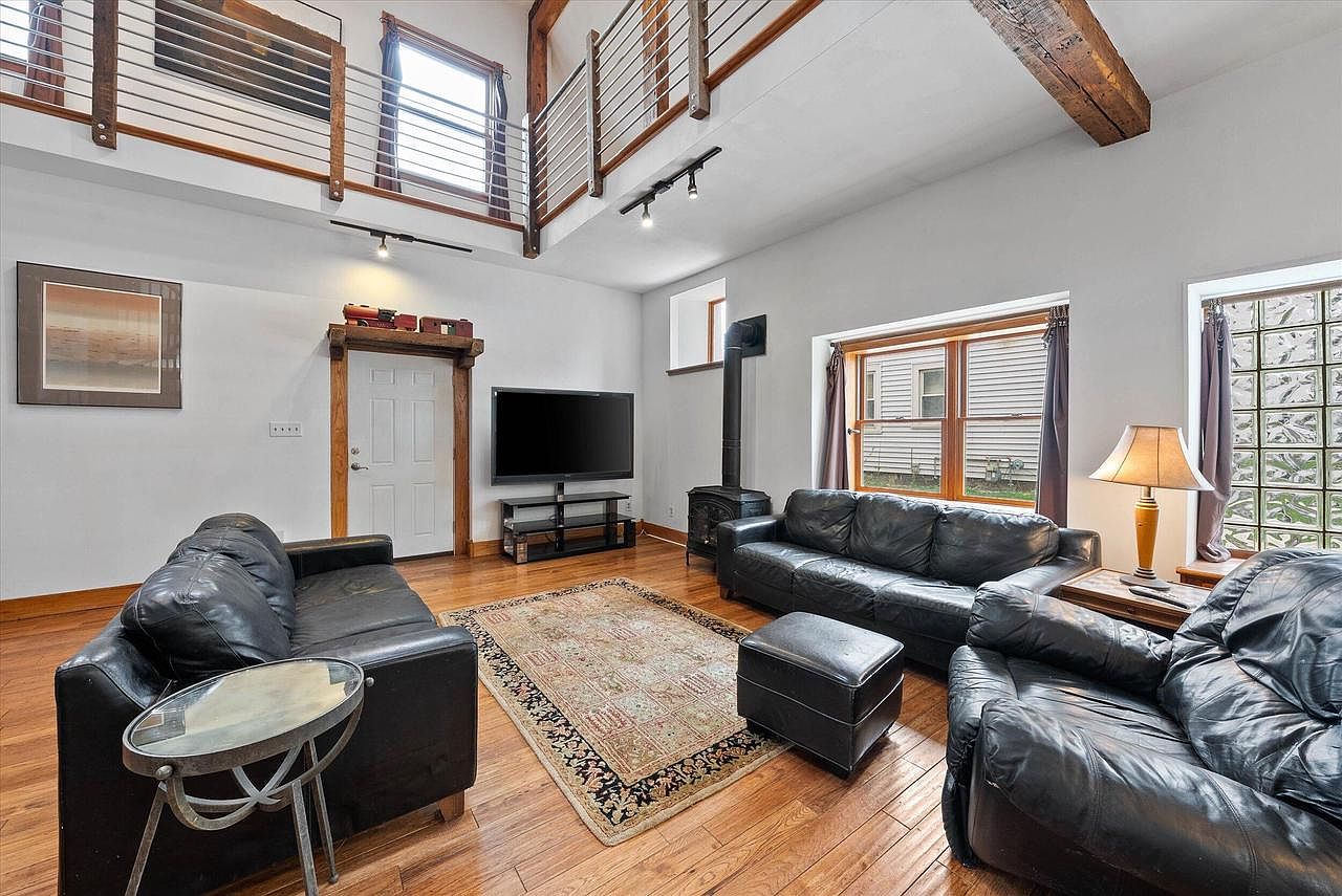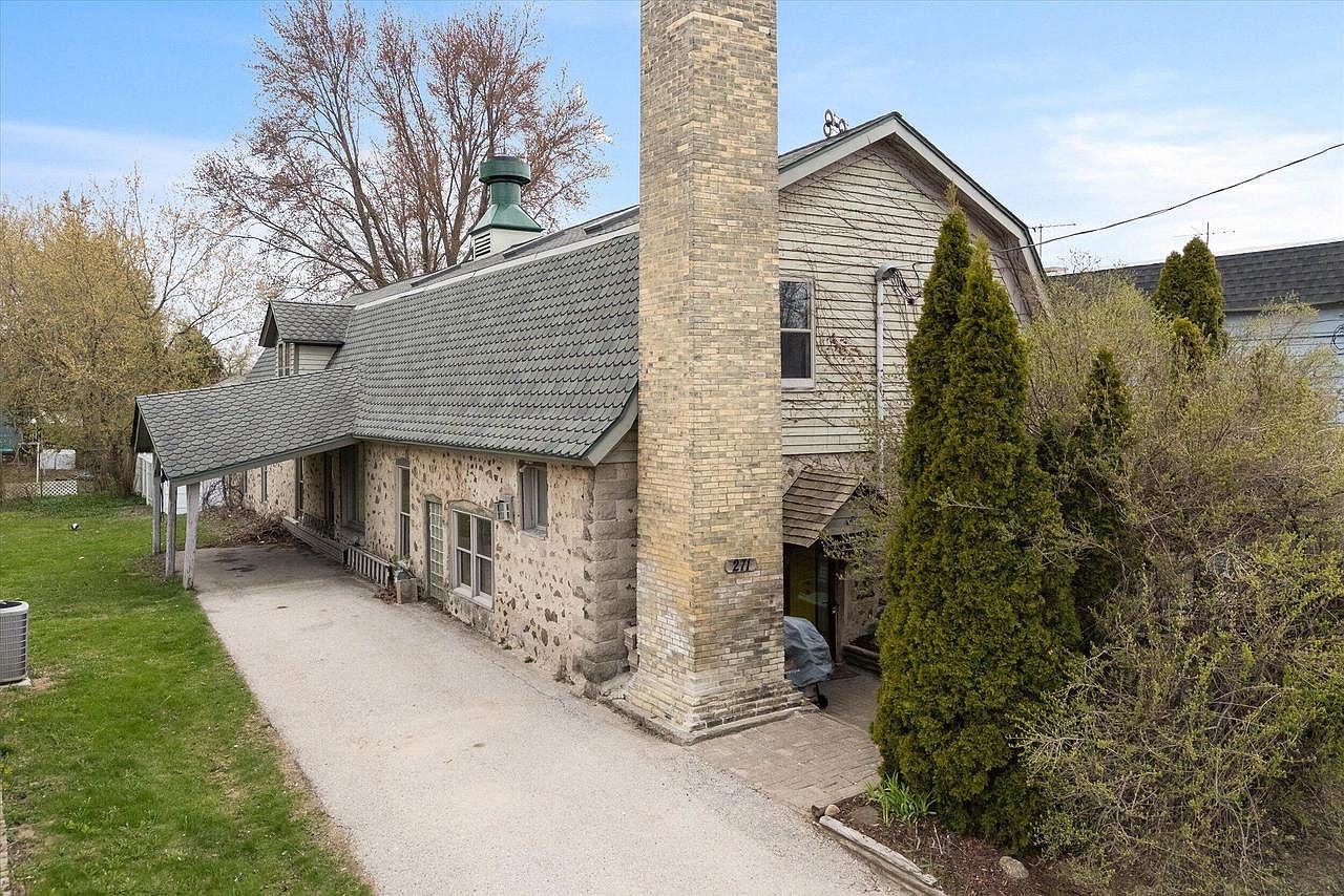 This charming home located in Saukville, WI, showcases a unique barn-style architectural design, harmoniously blending rustic aesthetics with modern living comforts. The distinctive barn-style roofline and stone exterior create a warm and inviting facade. The property features 4 bedrooms and 2 full bathrooms, with an impressive soaring ceiling upon entry that enhances the open-concept layout. One bedroom and a full bath are conveniently situated on the main floor, while a spiral staircase leads to the second floor where three additional bedrooms and another full bath are located. A standout feature of this property is the attached 42′ by 26′ garage/workshop, which includes a versatile second floor space ideal for multiple uses, making this home especially unique. Listed at $299,900, this home offers an exceptional opportunity to own a one-of-a-kind property in Saukville.